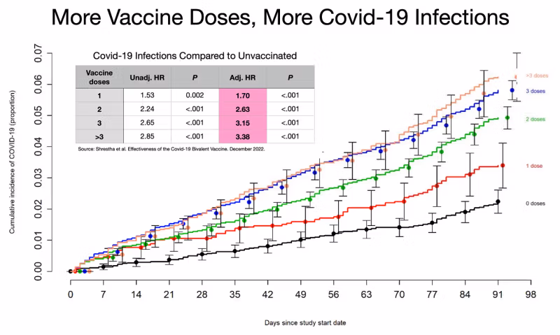 Cei care au primit o doză de vaccin au suferit mai multe infecții decât cei cu zero. Modelul a continuat până în sus pe scara de dozare (vezi diagrama treptei din apropiere). Două doze au fost mai rele decât una; trei erau mai răi decât doi; iar patru sau mai multe erau mai rele decât trei. De fapt, cei cu 3 sau mai multe doze au fost de mai mult de trei ori la fel de probabil să contracteze Covid ca și cei nevaccinati. Un japonez nou-nouț studiu au găsit același lucru: cei vaccinați au fost mai mult de două ori la fel de probabil să fie infectat.