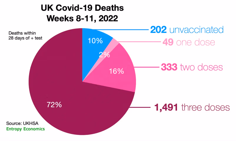 Desigur, infecțiile nu se pot traduce direct în decese. Dar datele de mortalitate din Marea Britanie pentru aceeași perioadă contrazic, de asemenea, ideea că vaccinarea previne un număr mare de decese cauzate de Covid sau orice deces cauzat de Covid. În săptămânile 8-11 2022, 90% dintre decesele de Covid s-au produs la cei vaccinați, doar 10% la cei nevaccinati. Pentru perioada de șapte luni din august 2021 până în februarie 2022, cei vaccinați au reprezentat 84.7% din toate decesele de Covid în Scoția.