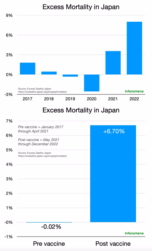 În diverse țări extrem de vaccinate, cum ar fi Germania, Japonia, Taiwan, Australia, Singapore, Irlanda, Israel și multe altele, mortalitatea și morbiditatea au crescut vertiginos în 2021 și 2022 și au rămas ridicate în 2023 și 2024. A se vedea, de exemplu, aceste sondaje privind excesul de mortalitate globală:
